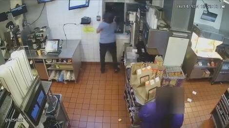 Surveillance video obtained by authorities shows the young woman throwing drinks at customers through the drive-thru window. A man allegedly responded with the same action by throwing glasses at M.me Gardner.