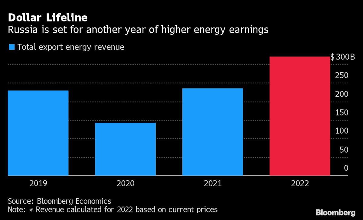 Even with Russia remaining mostly isolated from the global economy, Bloomberg Economics expects the country to earn nearly $321 billion from energy exports this year, up more than a third from 2021.