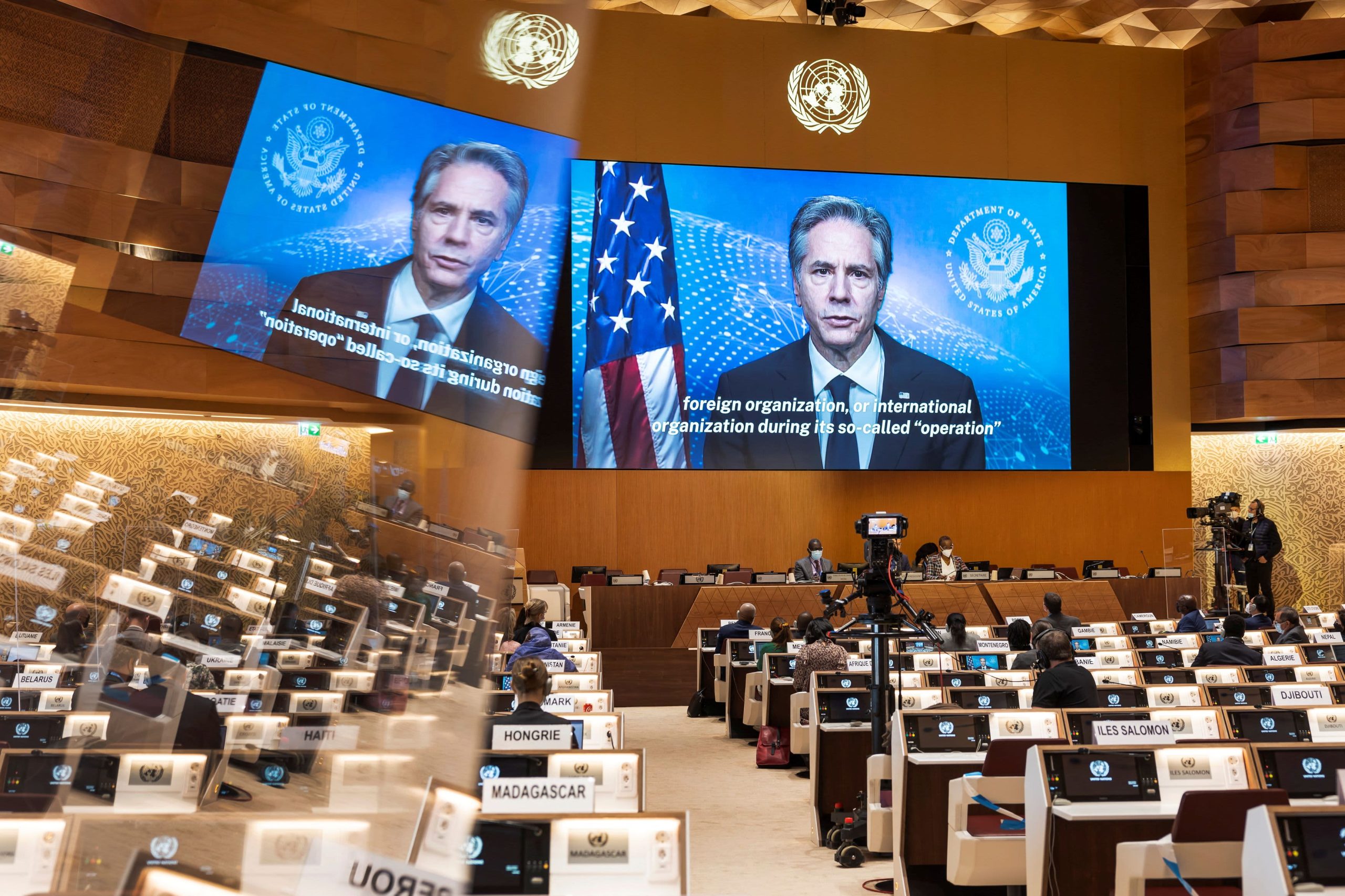 US Secretary of State Anthony Blinken appears on a screen as he delivers a speech during the 49th session of the United Nations Human Rights Council at the United Nations European Headquarters in Geneva, Switzerland, March 1, 2022.