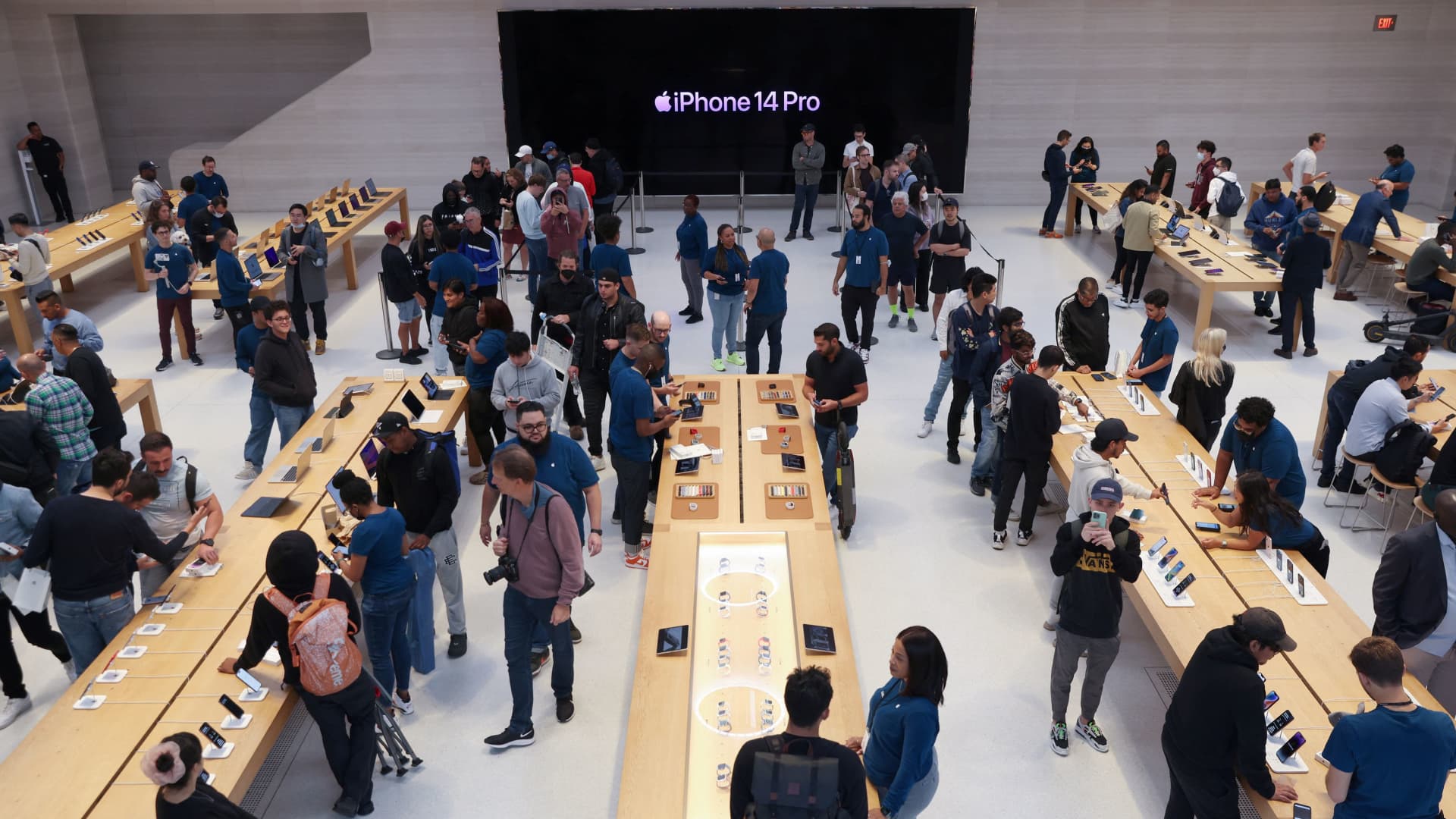 Customers shop at an Apple Fifth Avenue store for the launch of the Apple iPhone 14 in New York City, September 16, 2022.