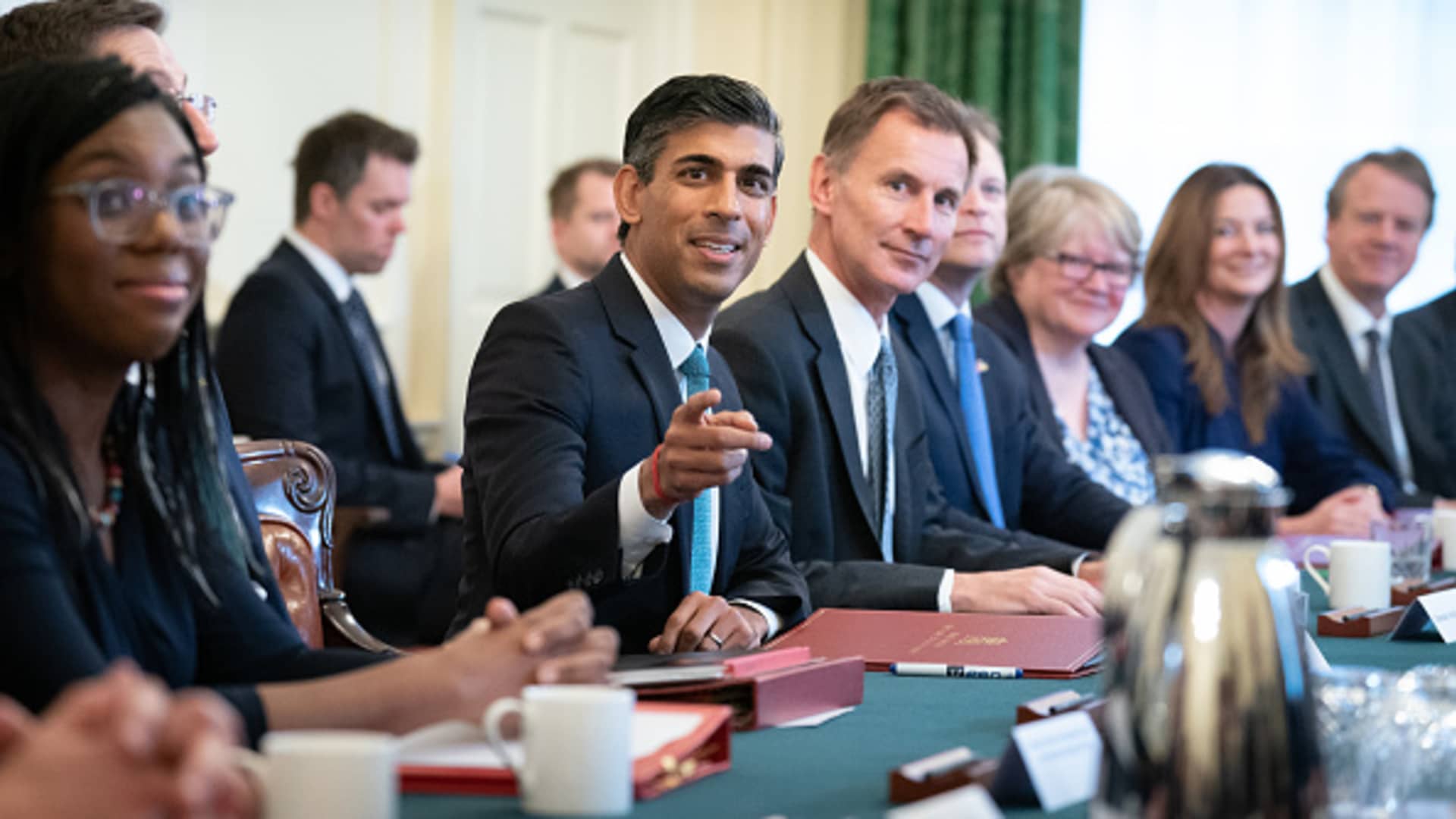 Prime Minister Rishi Sunak (centre), along with Chancellor of the Exchequer Jeremy Hunt (center right) hold their first cabinet meeting on October 26, 2022 in London, England.