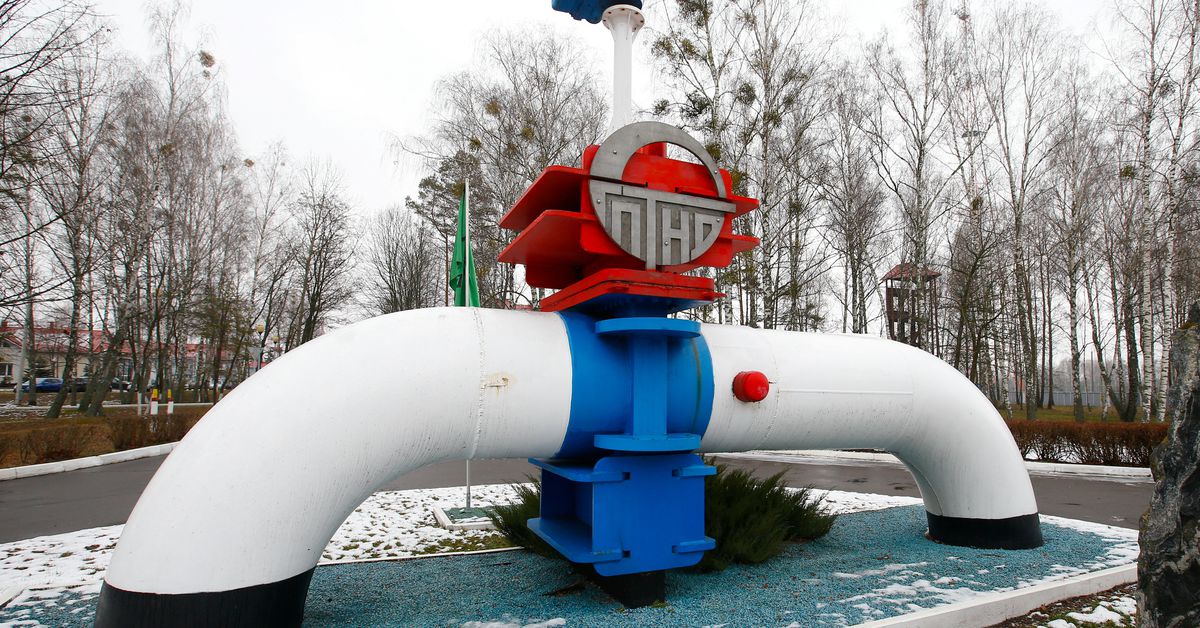 A model of a pipeline is shown at the main entrance to the Gomel Transneft oil pumping station, which transports crude through the North Druzhba pipeline westward to Poland and Europe, near Mozyr, Belarus, in this photo taken Jan. 4, 2020. REUTERS/Vassily Fedosenko