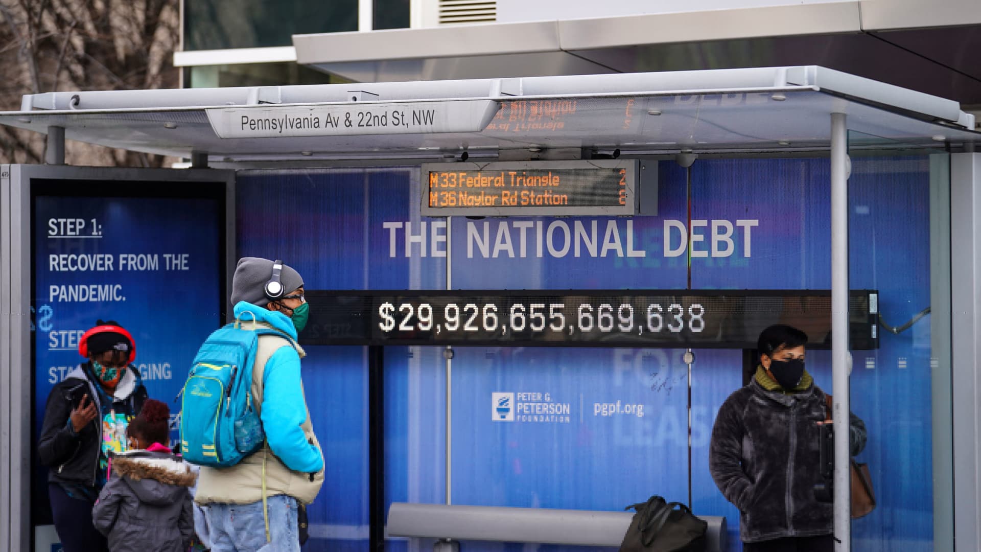 People wearing protective masks wait at a bus stop with a display of the current national debt amid the coronavirus (COVID-19) pandemic in Washington, Jan. 31, 2022.
