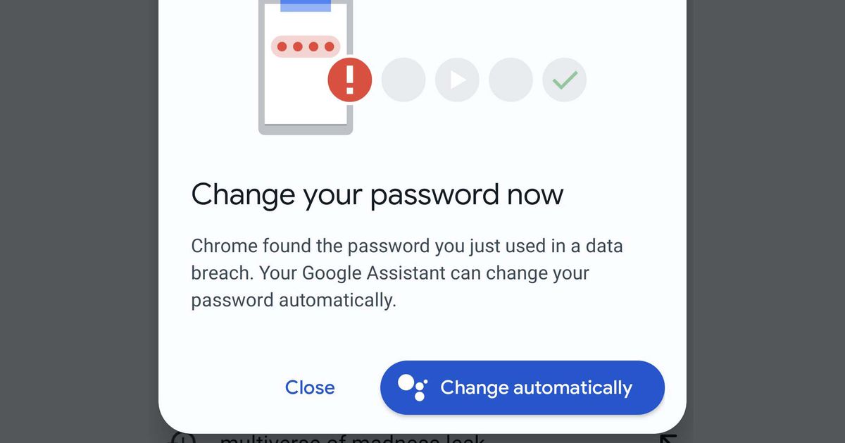 One of Weinbach’s screenshots shows a dialog warning that Chrome on Android has detected that a password in use appeared in a breach, and provides an option to “change automatically.” The second includes a confirmation box, asking the user to agree to “Allow Google Assistant to help you change your password”.