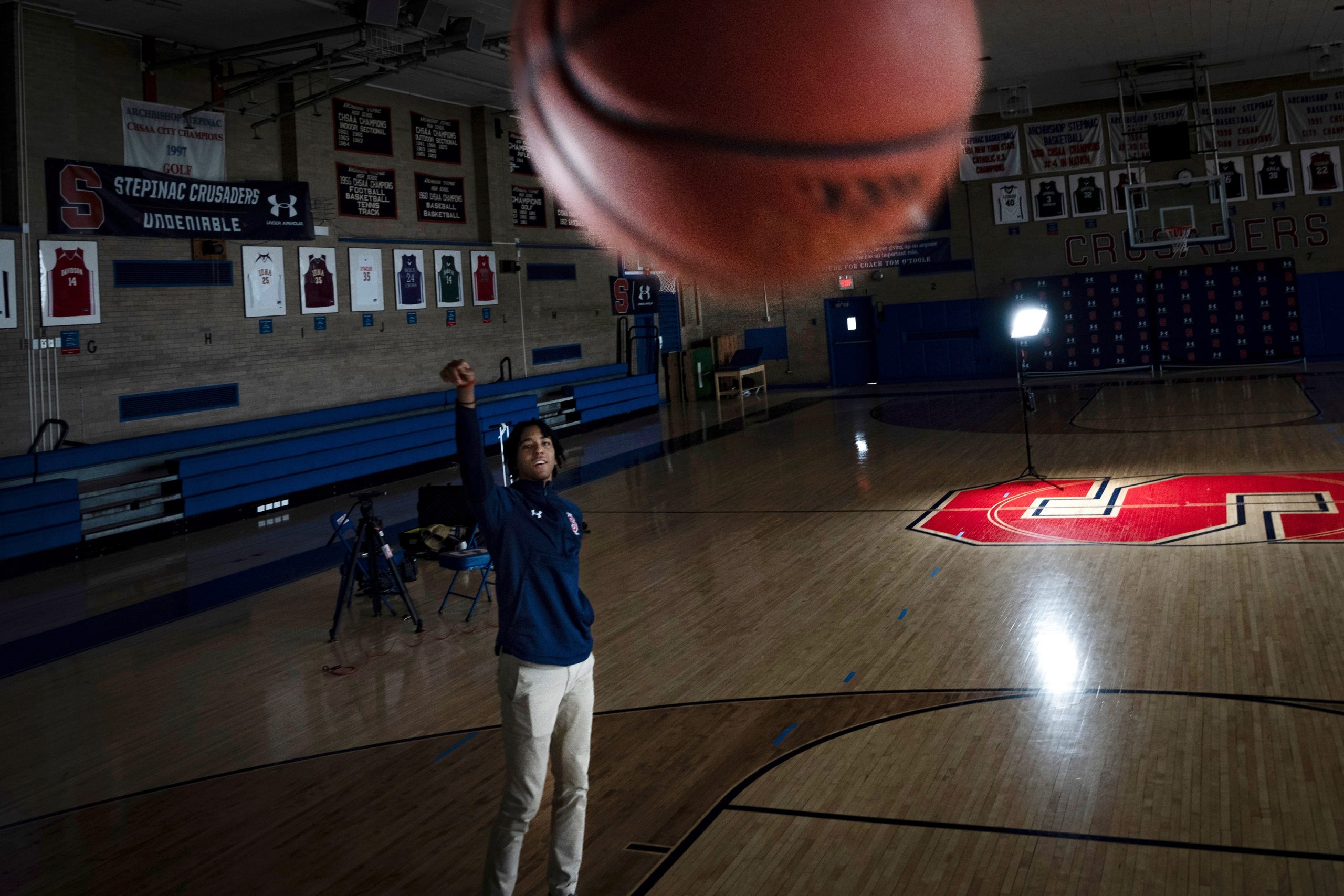 Jonuel “Boogie” Fland shoots hoops in the gymnasium at Archbishop Stepinac High School in White Plains, New York, Monday, May 2, 2022. Fland is among a growing number of high school athletes who have signed sponsorship agreements for their names and photos (AP newsroom)