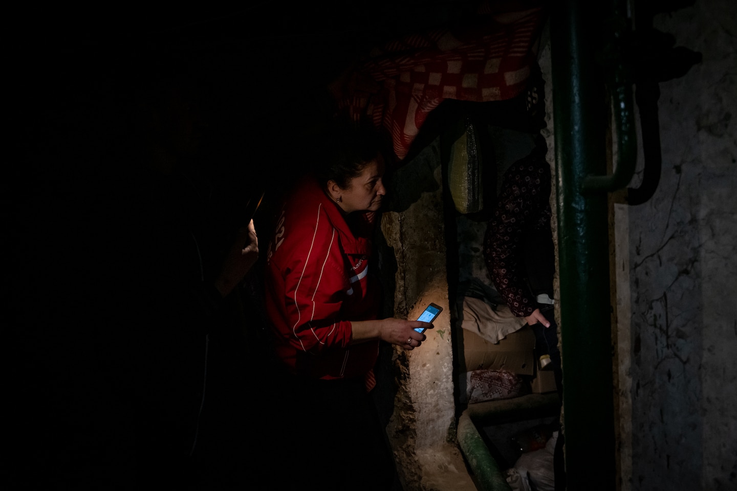 Her first and her husband, Alexander, ran a textile company in this basement before the start of the war. On the first day, they quickly converted it into a shelter and opened it to the neighborhood. They said hundreds of people have moved, causing an unsanitary situation. It was winter in one of the most northern cities of Ukraine, and the basement was not warm. Signs of mold and mildew are present on exposed pipes and ceiling.
