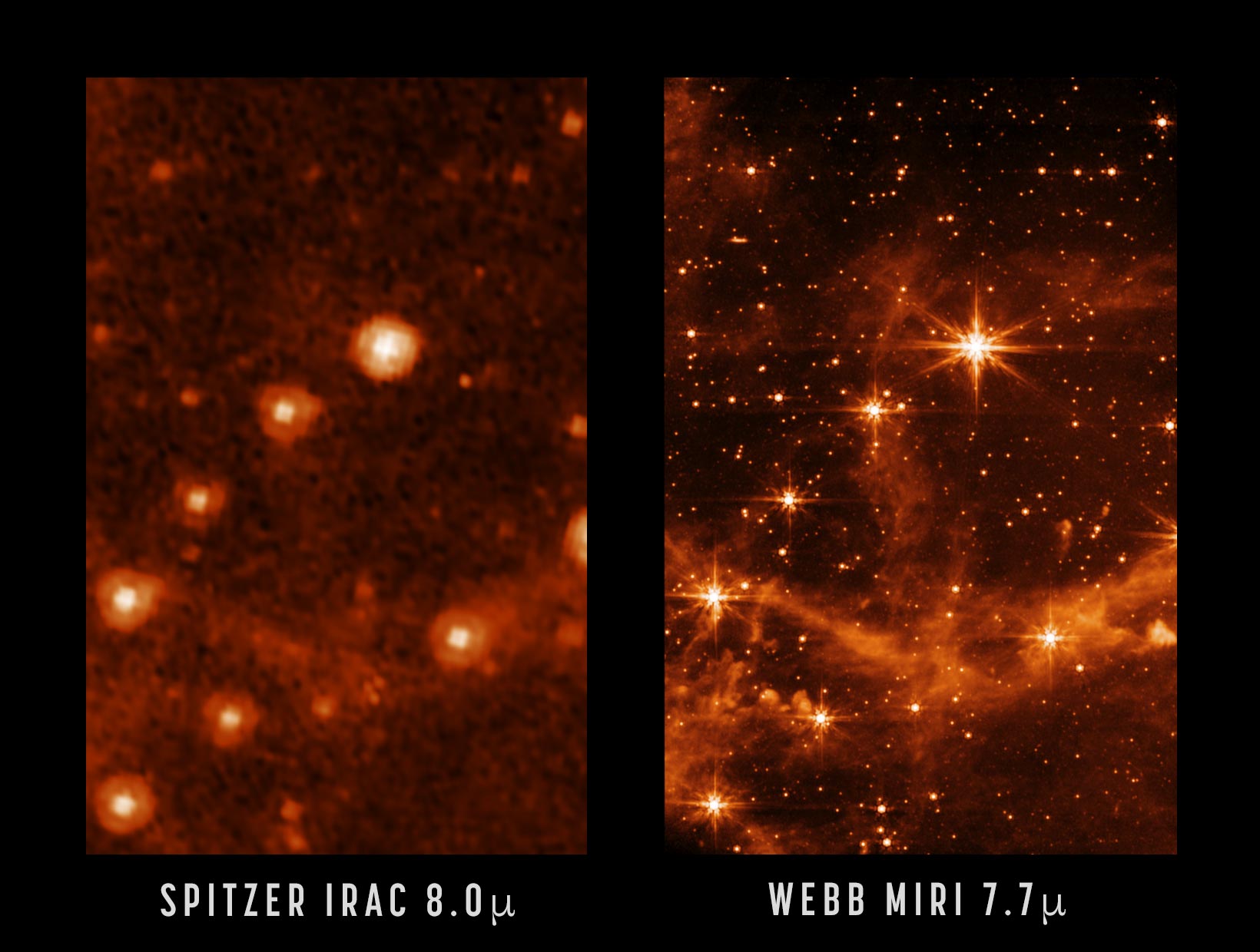 Here, a close-up of the MIRI image is compared to a past image of the same target taken with NASA’s Spitzer Space Telescope’s Infrared Array Camera (at 8.0 microns). The retired Spitzer telescope was one of NASA’s Great Observatories and the first to provide high-resolution images of the near- and mid-infrared universe. Webb, with its significantly larger primary mirror and improved detectors, will allow us to see the infrared sky with improved clarity, enabling even more discoveries.
