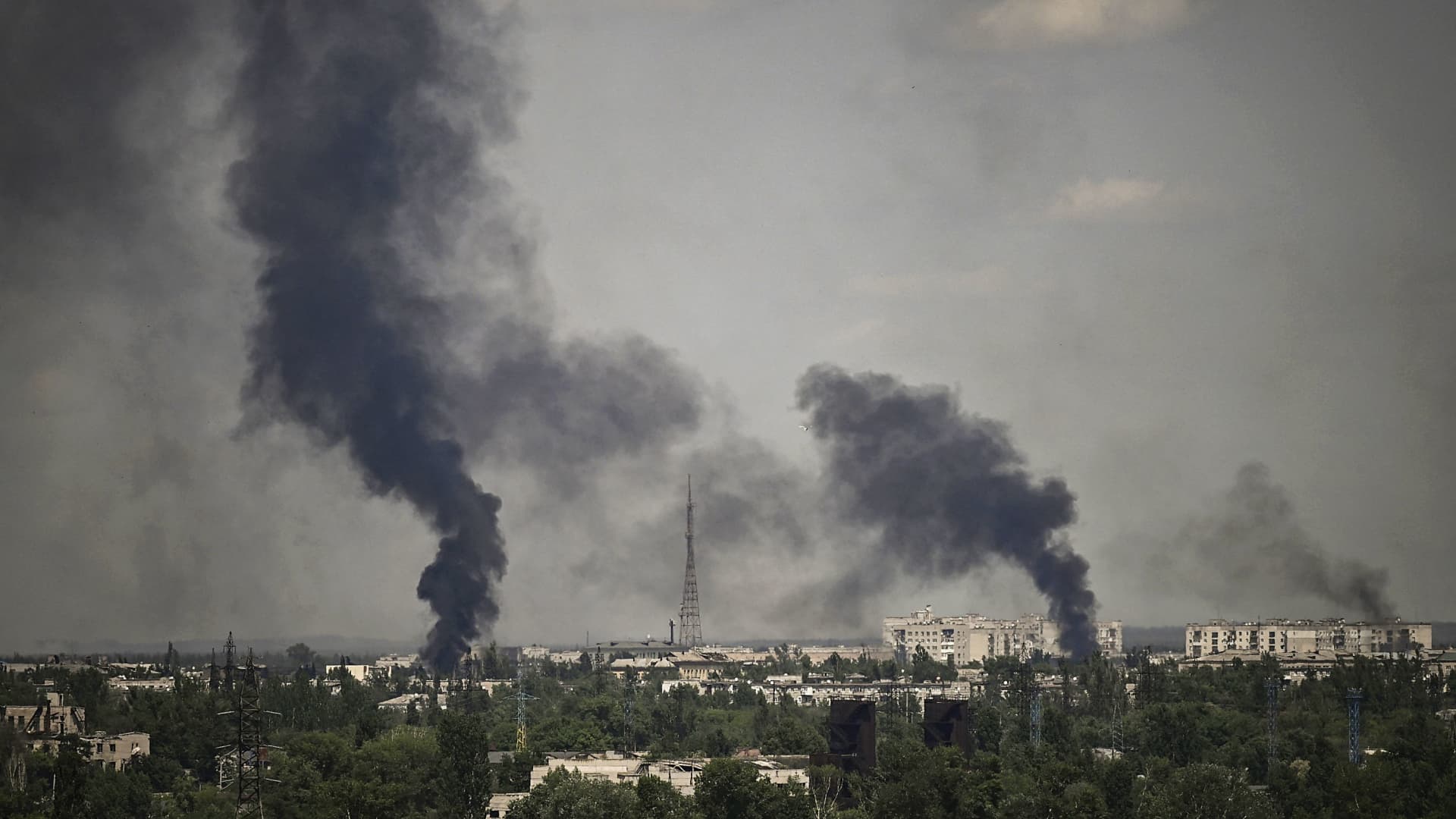 Smoke rises in the city of Severodonetsk during heavy fighting between Ukrainian and Russian forces in the Donbass region of eastern Ukraine on May 30, 2022, the 96th day of Russia’s invasion of Ukraine.