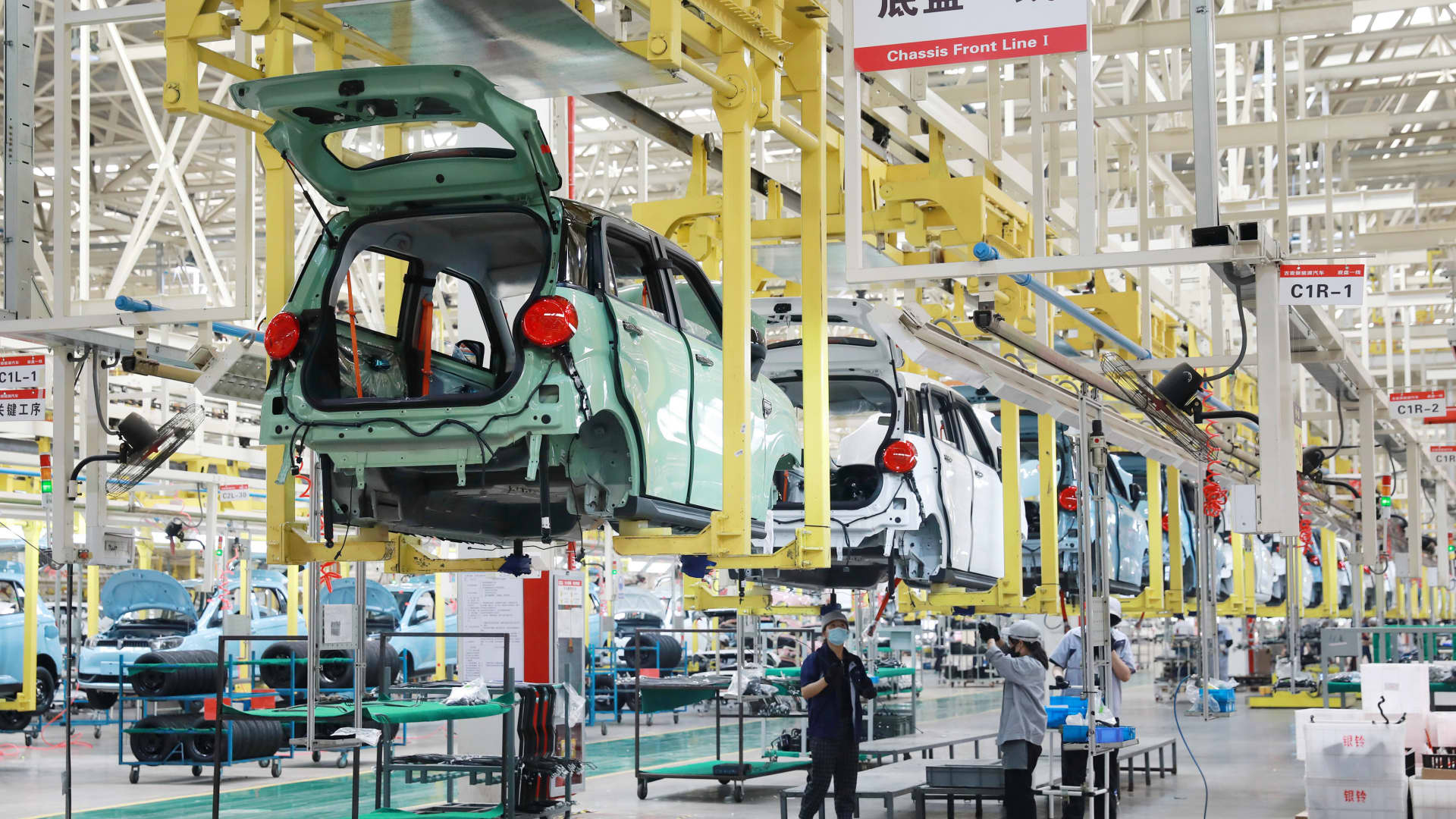 New energy vehicles, which include hybrid and battery cars, have seen an increase in sales in China despite the stagnation in the auto market in general. Pictured, an unnamed new energy automobile plant in Jiangsu Province on June 13, 2022.