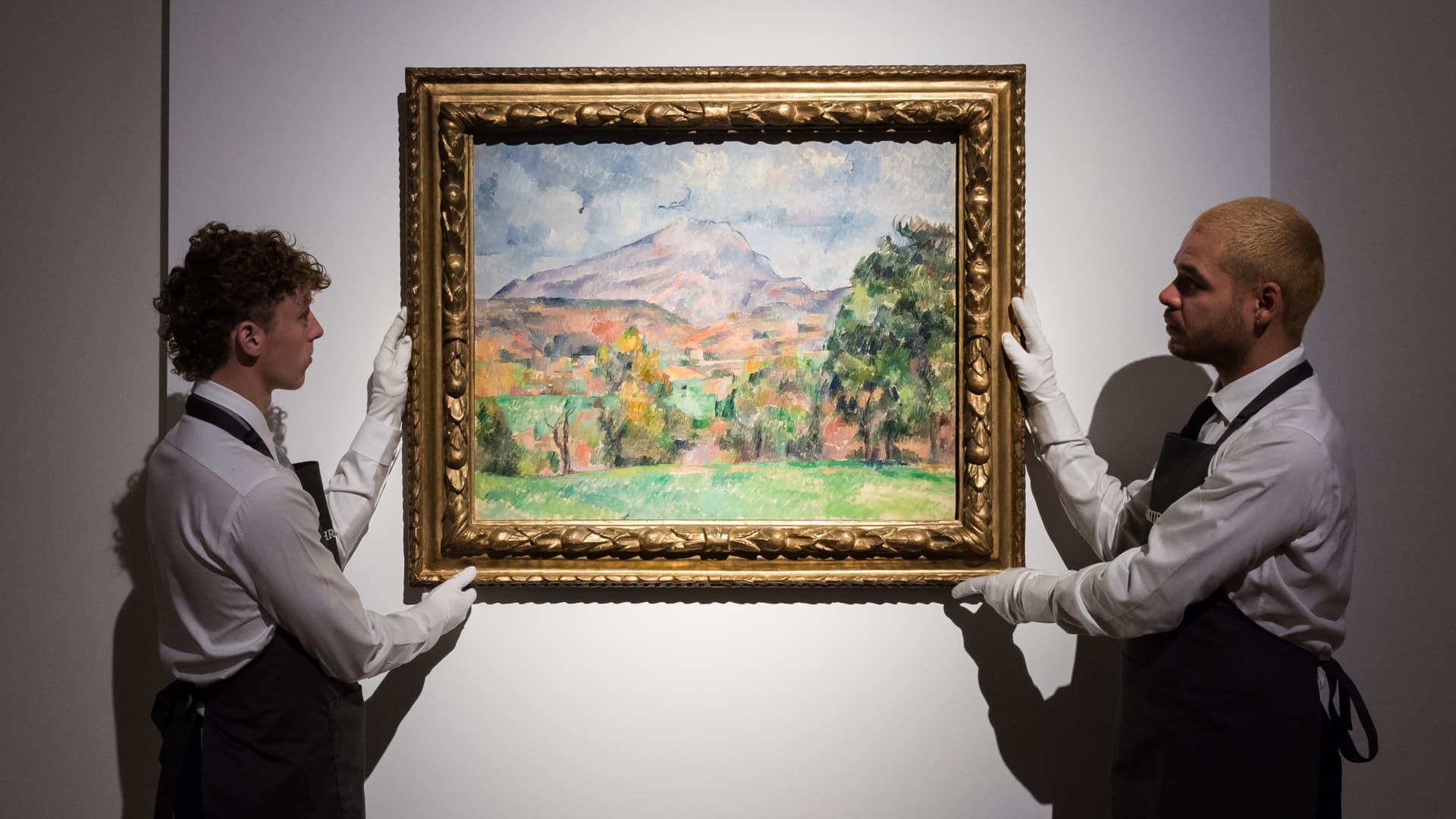 Art purveyors hold a painting “La montagne Sainte-Victoire” by Paul Cézanne (estimate on demand: over $120,000,000) during a video call to present the highlights from the property of philanthropist and Microsoft co-founder, Paul G. Allen in London on October 14, 2022 .