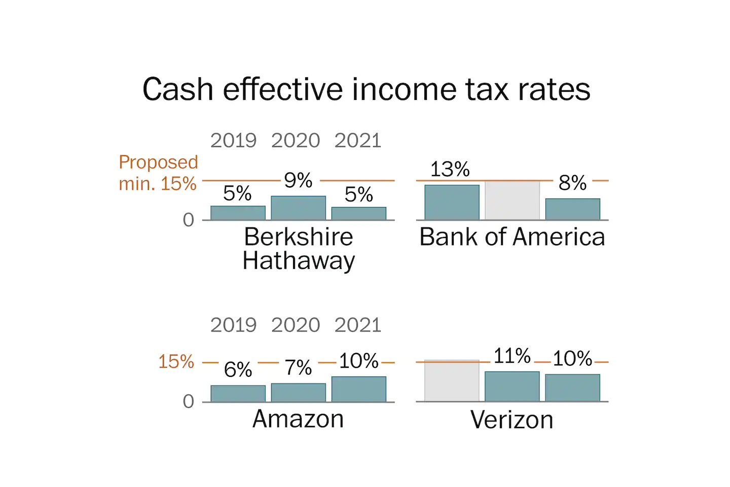 More than 250 companies in the S&P 500 have averaged pre-tax income of more than $1 billion over the past three years, according to a Washington Post analysis of Calcbench data. Of those, 83 paid less than 15 percent in income tax globally. The list includes technology companies such as Amazon and Intel, banks such as Bank of America and US Bancorp, telecom giants Verizon and AT&T, and other familiar names such as General Motors and UPS.