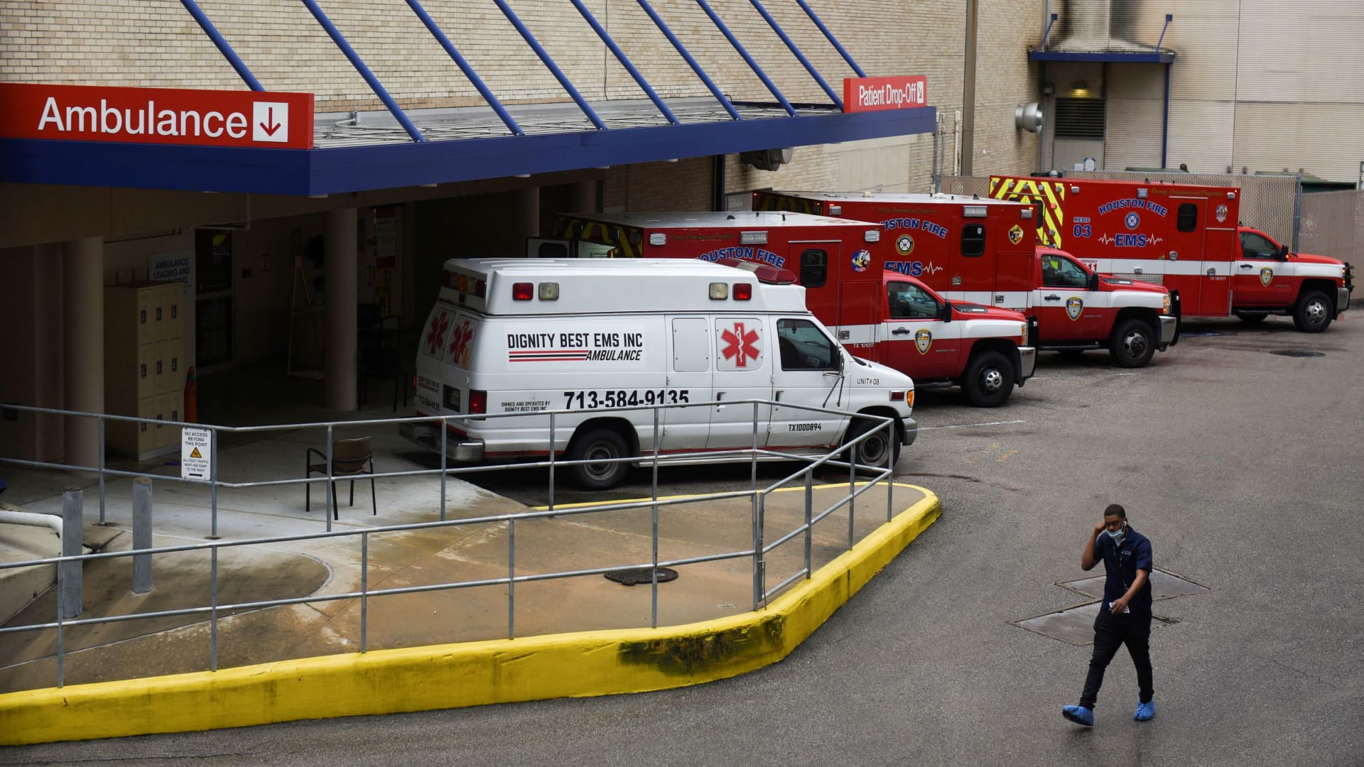 A medical worker passes by a row of parked ambulances outside Houston Methodist Hospital amid the global coronavirus (COVID-19) outbreak. In Houston, Texas, United States, June 22, 2020.