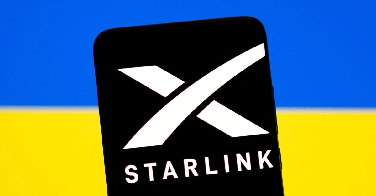 The Starlink logo appears on a smartphone in front of the Ukrainian flag displayed in this illustration taken on February 27, 2022. REUTERS / Dado Ruvic / Illustration