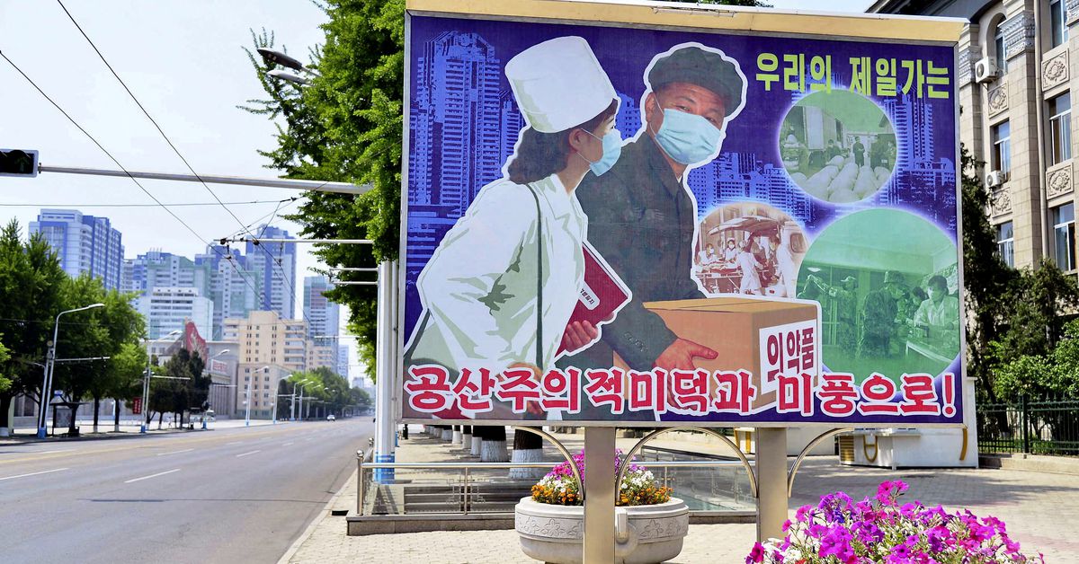 A banner depicting a scene of medical products being transported on an empty street, amid growing concerns about the spread of the coronavirus disease (COVID-19), is displayed in Pyongyang, North Korea, in this photo posted by Kyodo on May 23, 2022. Kyodo via Reuters