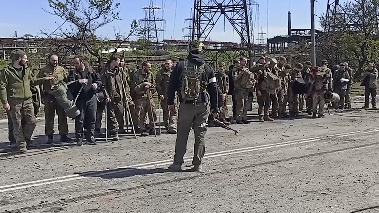 In this image taken from a video released by the Russian Defense Ministry’s press service on Wednesday, May 18, 2022, Ukrainian soldiers stand in front of a Russian soldier after leaving the besieged Azovstal steel plant in Mariupol, Ukraine.
