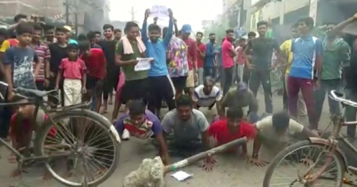 Demonstrators perform push-ups while protesting against the “Agnipath Scheme” to recruit personnel into the armed forces, in Munger, Bihar, India on June 16, 2022 in this still image obtained from a video post. Al-Ani / Handout via Reuters