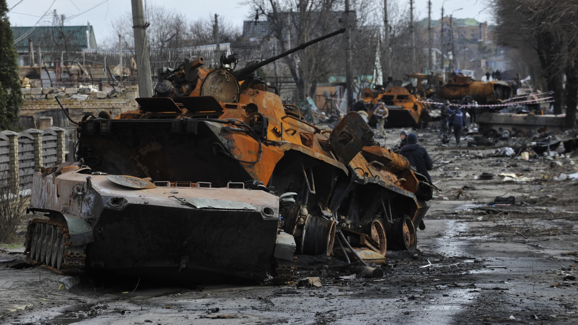 Destroyed military equipment of the Russian army in the city of Bucha.
