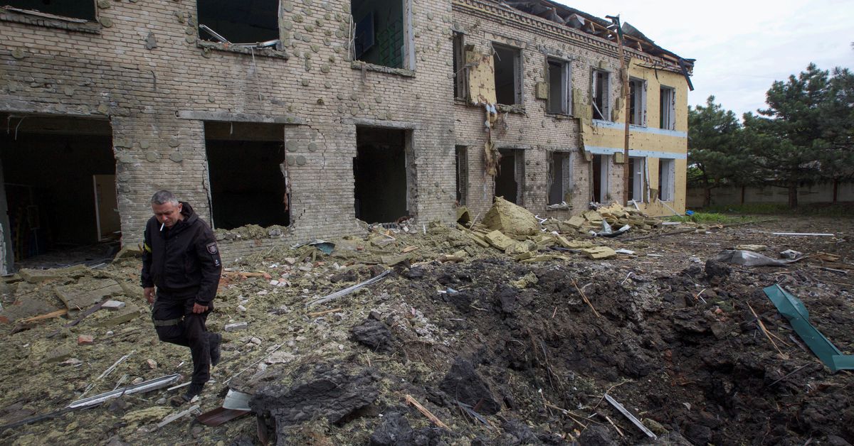 A police officer walks past a school building destroyed by a Russian military strike, as the Russian offensive on Ukraine continues, in the Kostiantynivka settlement, in Donetsk region, Ukraine, May 22, 2022. Photo taken May 22, 2022. REUTERS / Anna Kudriavtseva