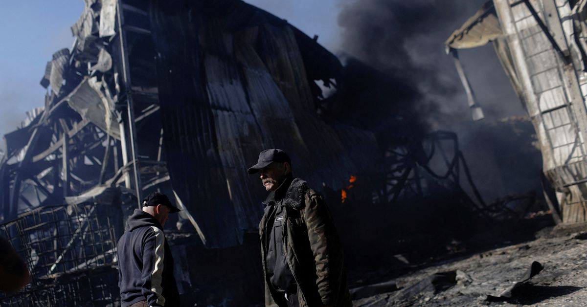 People walk in a devastated area inside a burning factory, after Russian bombing amid Russia’s attack on Ukraine, in Kharkiv, Ukraine, April 30, 2022. REUTERS/Ricardo Moraes