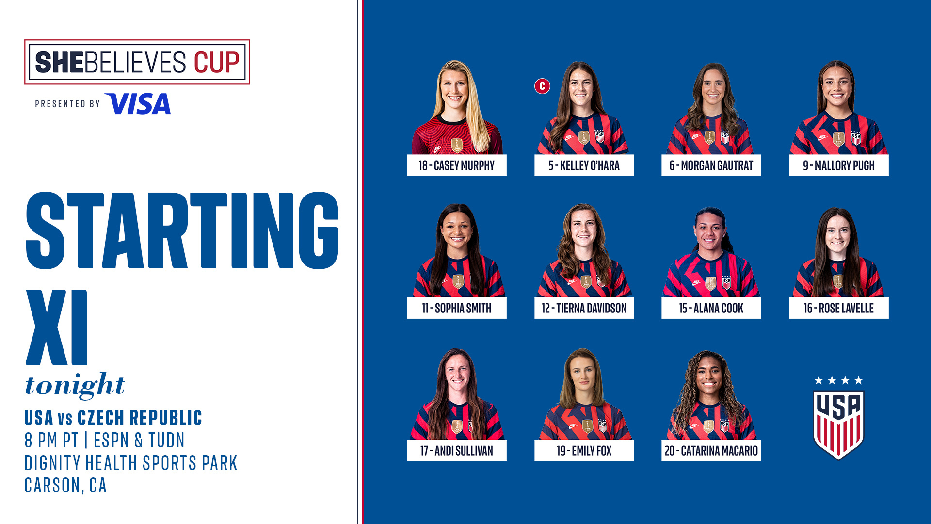 Starting in XI against the Czech Republic: 18-Casey Murphy, 5-Kelly O’Hara (Captain), 6-Morgan Gutraat, 9-Mallory Poe, 11-Sofia Smith, 12-Terna Davidson, 15-Alana Cook, 16-Rose Lavelle, 17-Andy Sullivan, 19- Emily Fox, 20-Catarina Macario