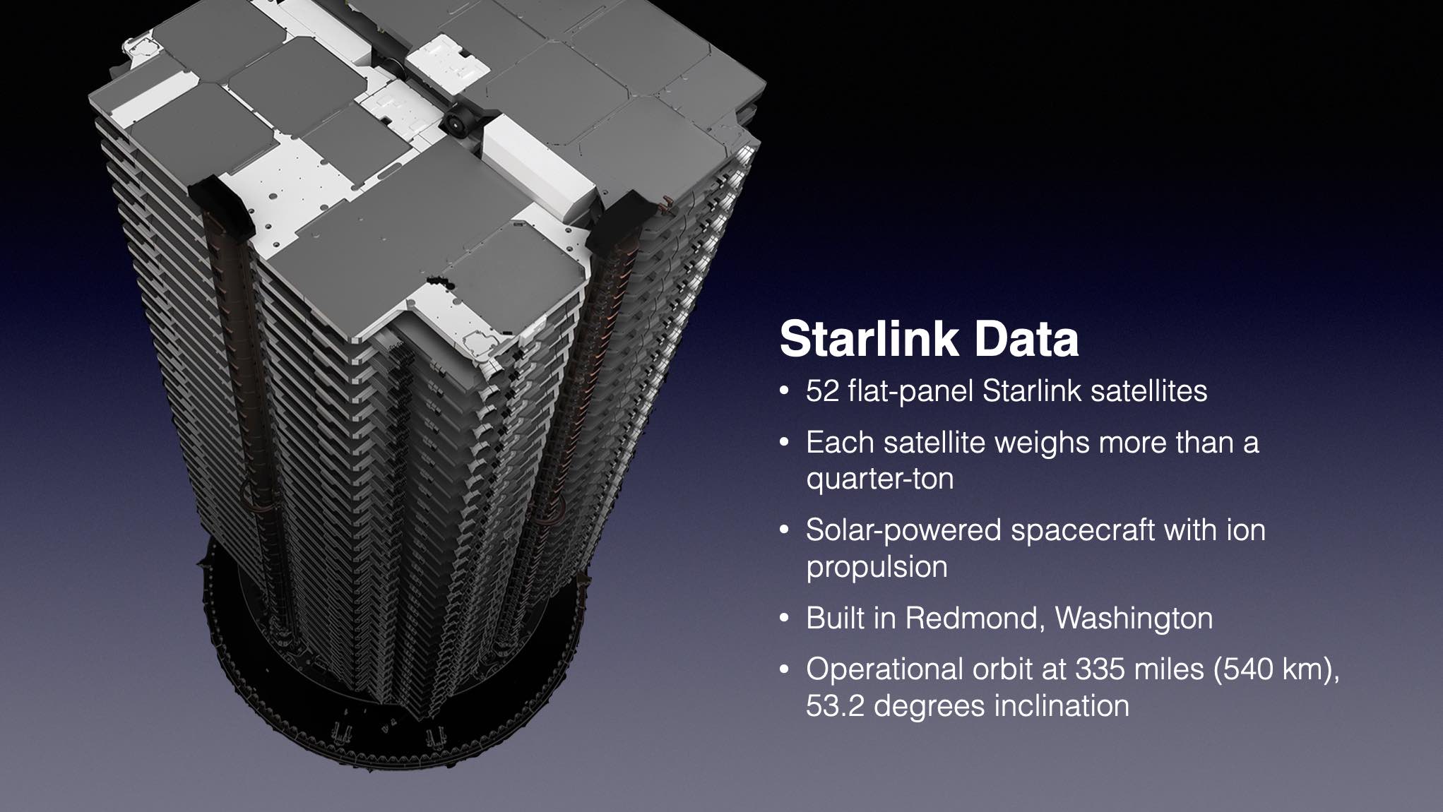 The Falcon 9 rocket will head northeast of the Kennedy Space Center, aiming to deliver packed broadband relay stations into an orbit between 144 miles and 208 miles (232 x 338 kilometers). 52 flat-packed satellites will be deployed from the upper stage of the Falcon 9 about 15 minutes after liftoff.