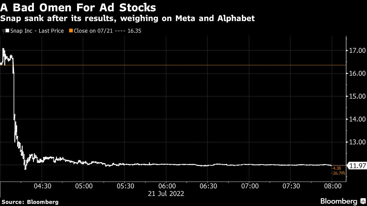 The losses represent Snap’s second big sell-off in two months, with its results becoming a barometer for investors trying to understand how economic uncertainty is affecting ad spending. There are growing signs that tech companies are preparing for a recession with some pulling back on hiring, while Meta has lost about half its value this year after disappointing revenue forecasts.