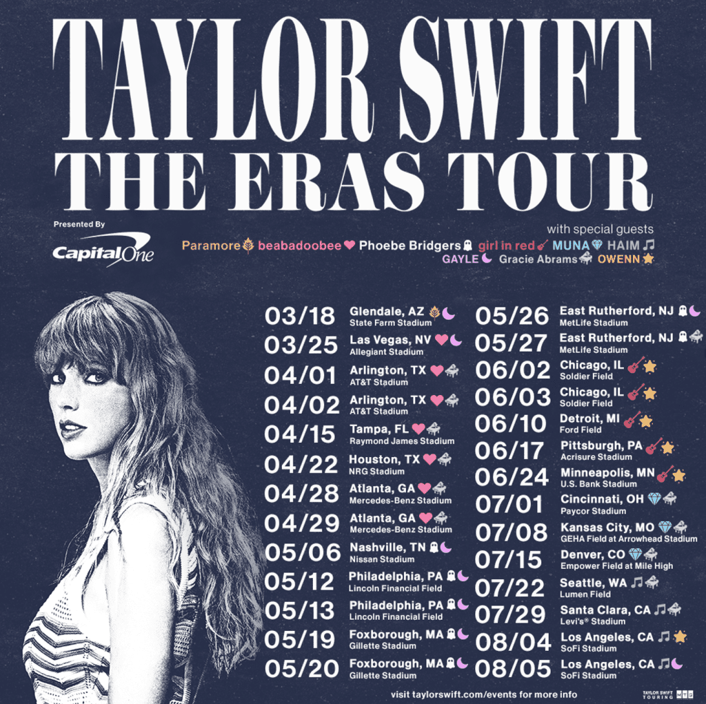 The tour begins March 18, 2023 in what appears to be a beautiful setting for Swift, Glendale, AZ, which is the same place where her last outing, the “Reputation” tour before the pandemic, began in 2018.