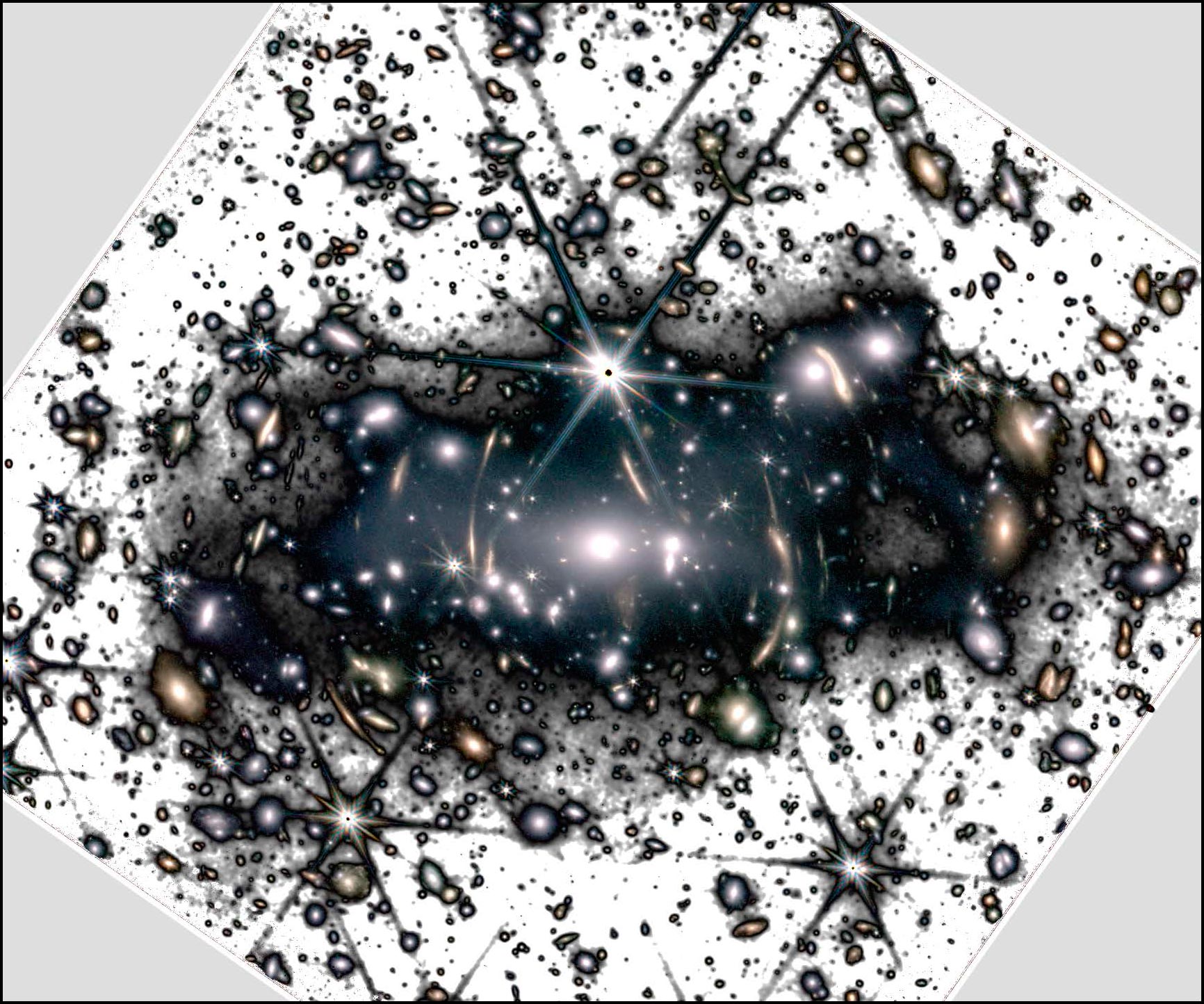 An image of the light inside the cluster SMACS-J0723.3-7327 was acquired with a NIRCAM camera on a Webb plate. The data was processed by the IAC team to improve the detection of intergalactic faint light (black and white). Credit: NASA, ESA, CSA, STScI