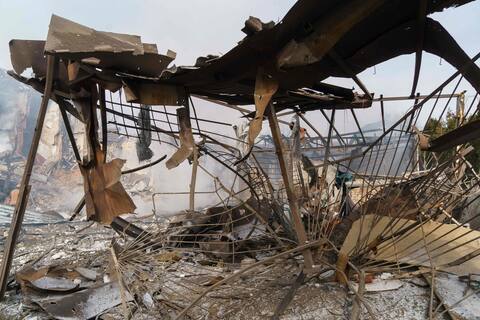 Video footage shows firefighters extinguishing a fire in a smoking wreck. Some buildings are nothing more than piles of beams and twisted metal structures.