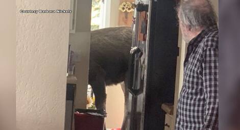 Just imagine. You let your dog out in the yard, leave the door open, and he can come in alone, but when he pokes his nose into the room, he has a friend following him, and a moose!