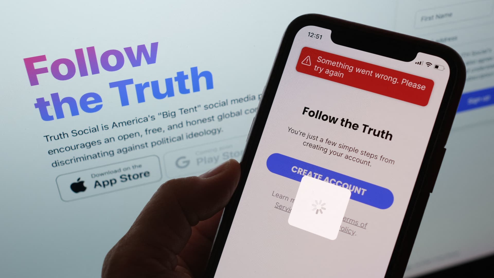 This illustration shows Donald Trump’s new social media app, Truth Social, swinging a smartphone in Los Angeles, February 21, 2022.