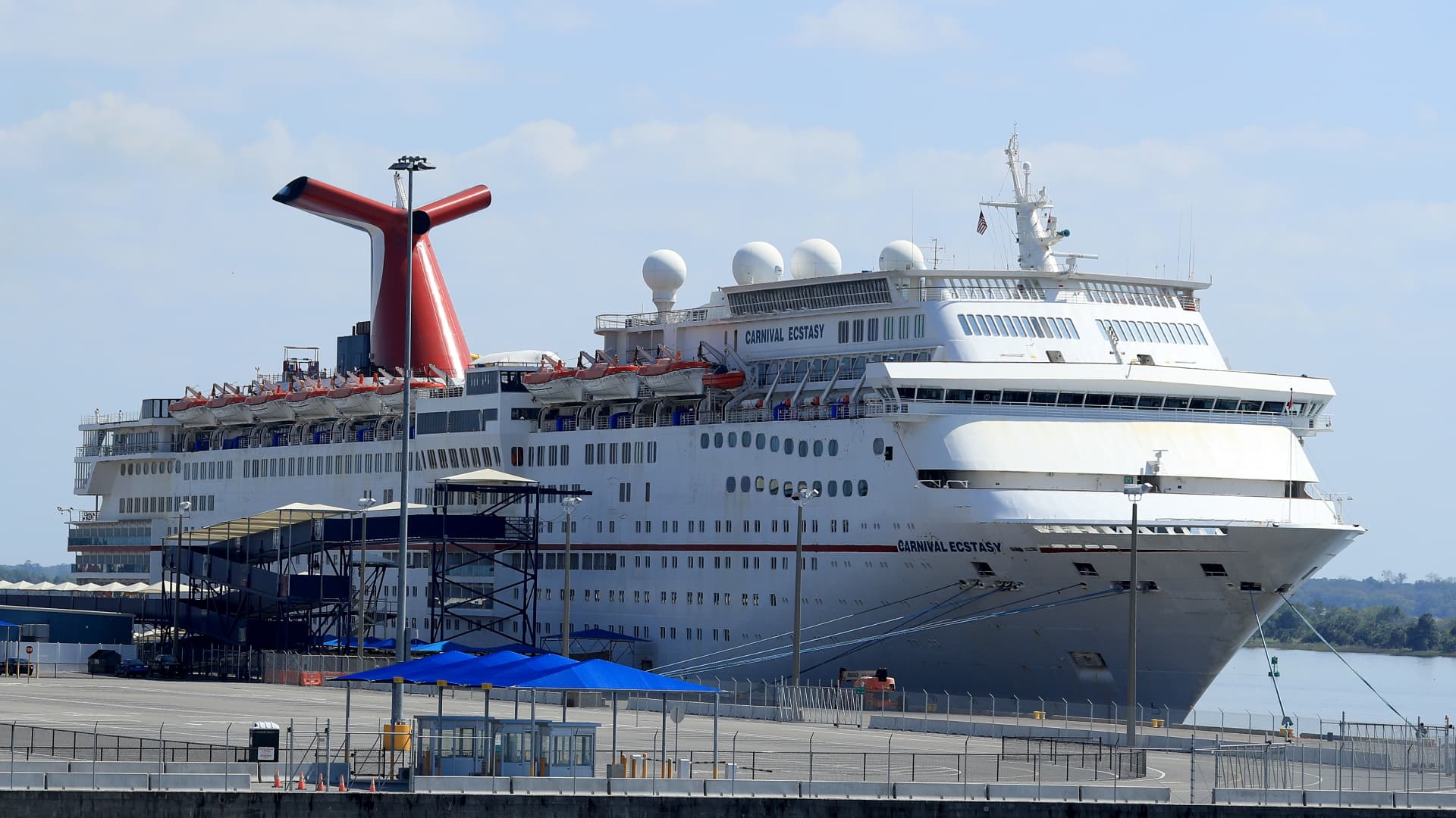 Carnival Cruise Line’s Carnival Ecstasy cruise ship docks in the Port of Jacksonville amid the coronavirus outbreak on March 27, 2020 in Jacksonville, Florida.