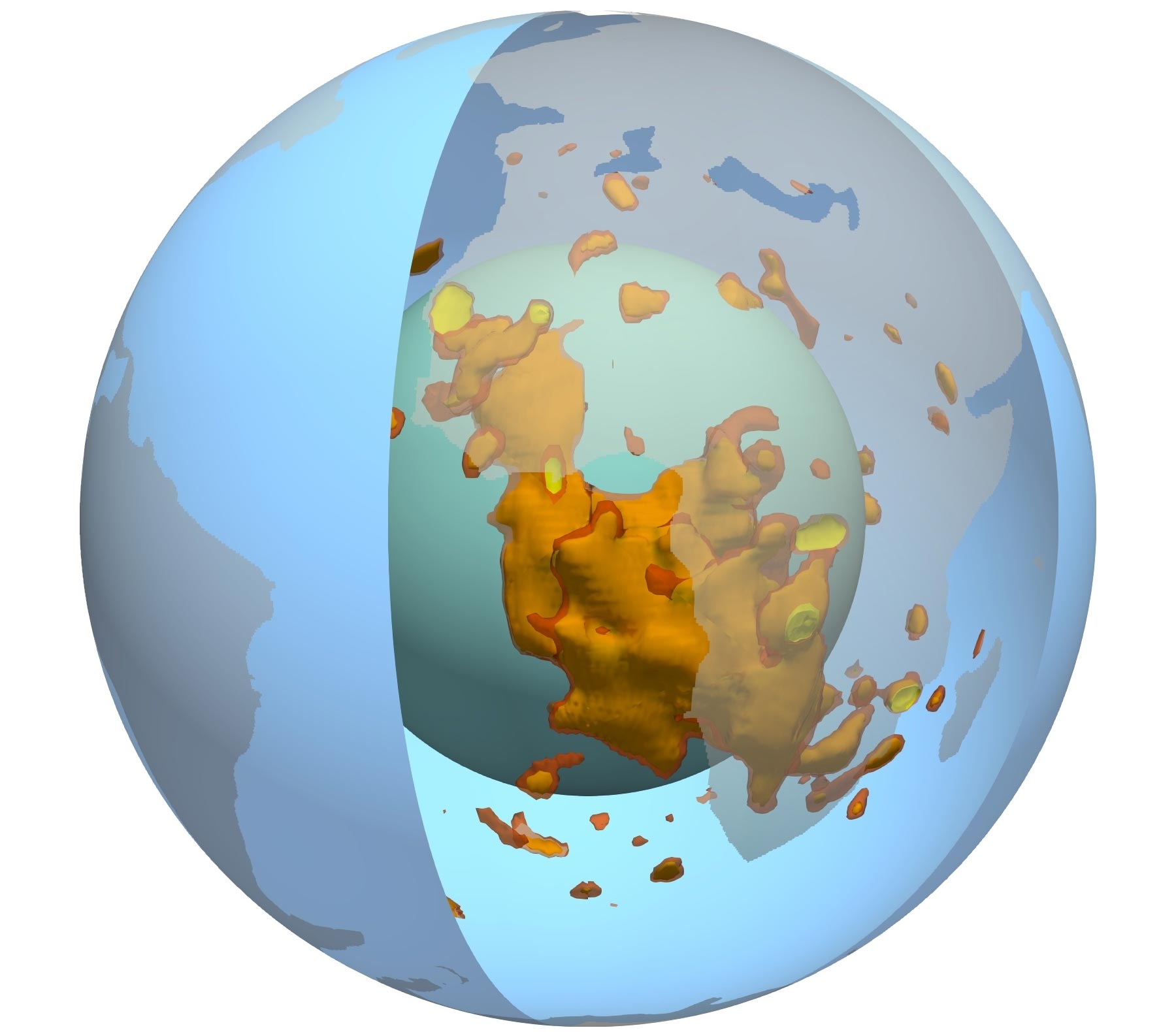 The earth is layered like an onion, with a thin outer crust, a thick, sticky mantle, a liquid outer core, and a solid inner core. Within the mantle, there are two massive point-like structures, roughly on either side of the planet. The points, officially referred to as Large Low Speed Provinces (LLSVPs), are each the size of a continent and 100 times taller than Mount Everest. One is located under the African continent, the other under the Pacific Ocean.