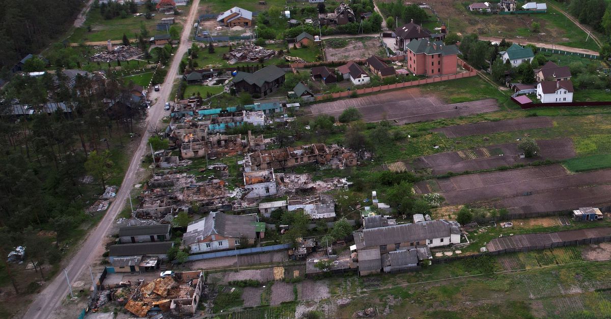 A view of the devastated village of Moshchon amid the Russian invasion, Kyiv region, Ukraine, May 19, 2022. The photo was taken with a drone. Photograph: Leonardo Pinassato/Reuters