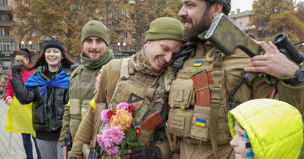 [1/5] Locals welcome Ukrainian soldiers as people celebrate after Russia’s withdrawal from Kherson in central Kherson, Ukraine on November 12, 2022. REUTERS/Lesko Krumblitz